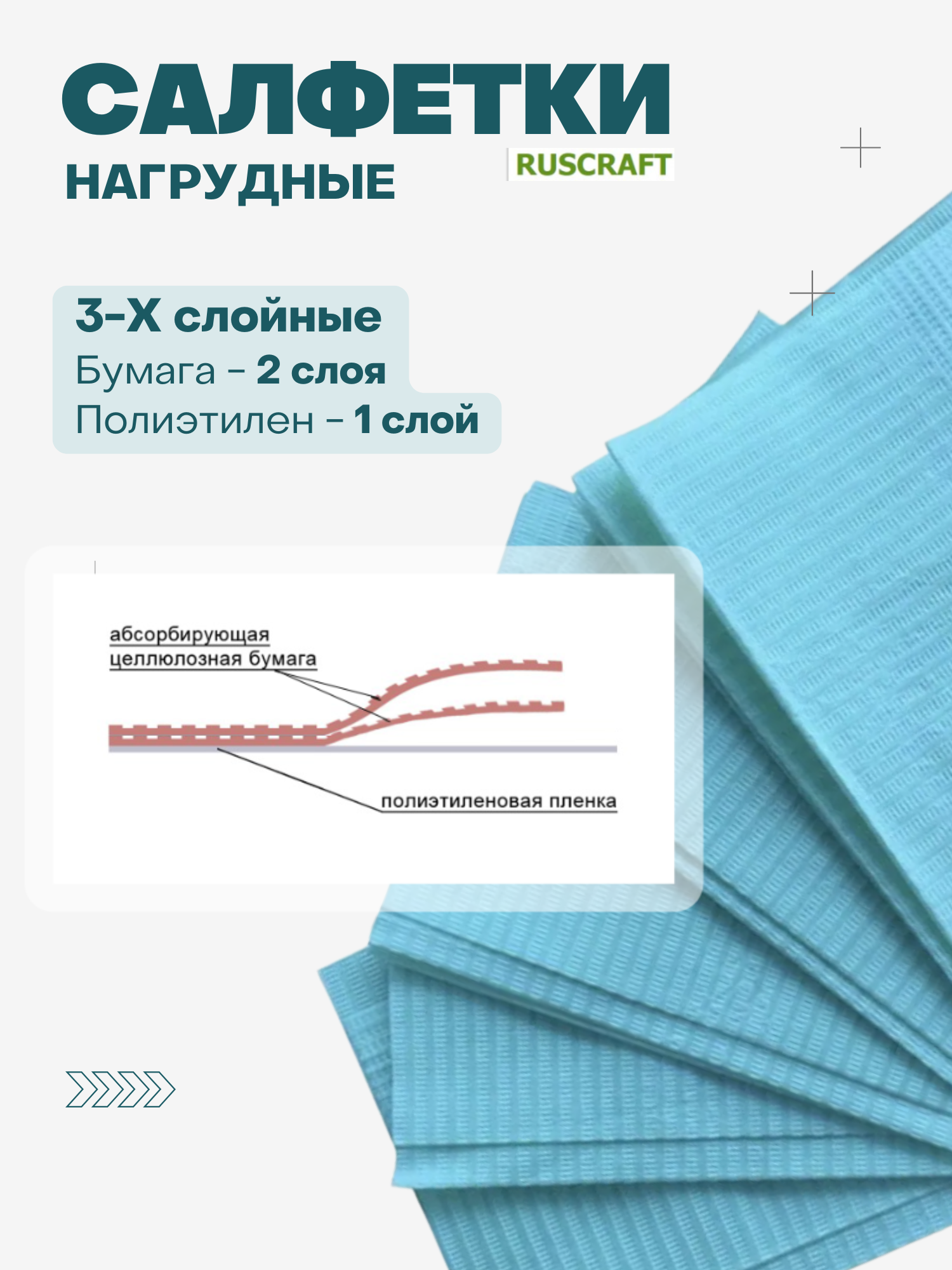 Салфетки нагрудники 3-х сл. РУСКРАФТ, цвет голубой, 33 х 45 см бумага/пластик, 500 шт.